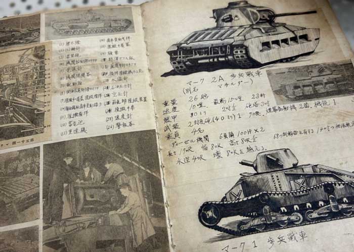 当時の軍事関連の愛好家、今で言うミリタリーオタク、通称『ミリオタ』(失礼)が所有していた、印刷物の切り抜きや手書きの緻密な機甲イラストが記されている古いノート。